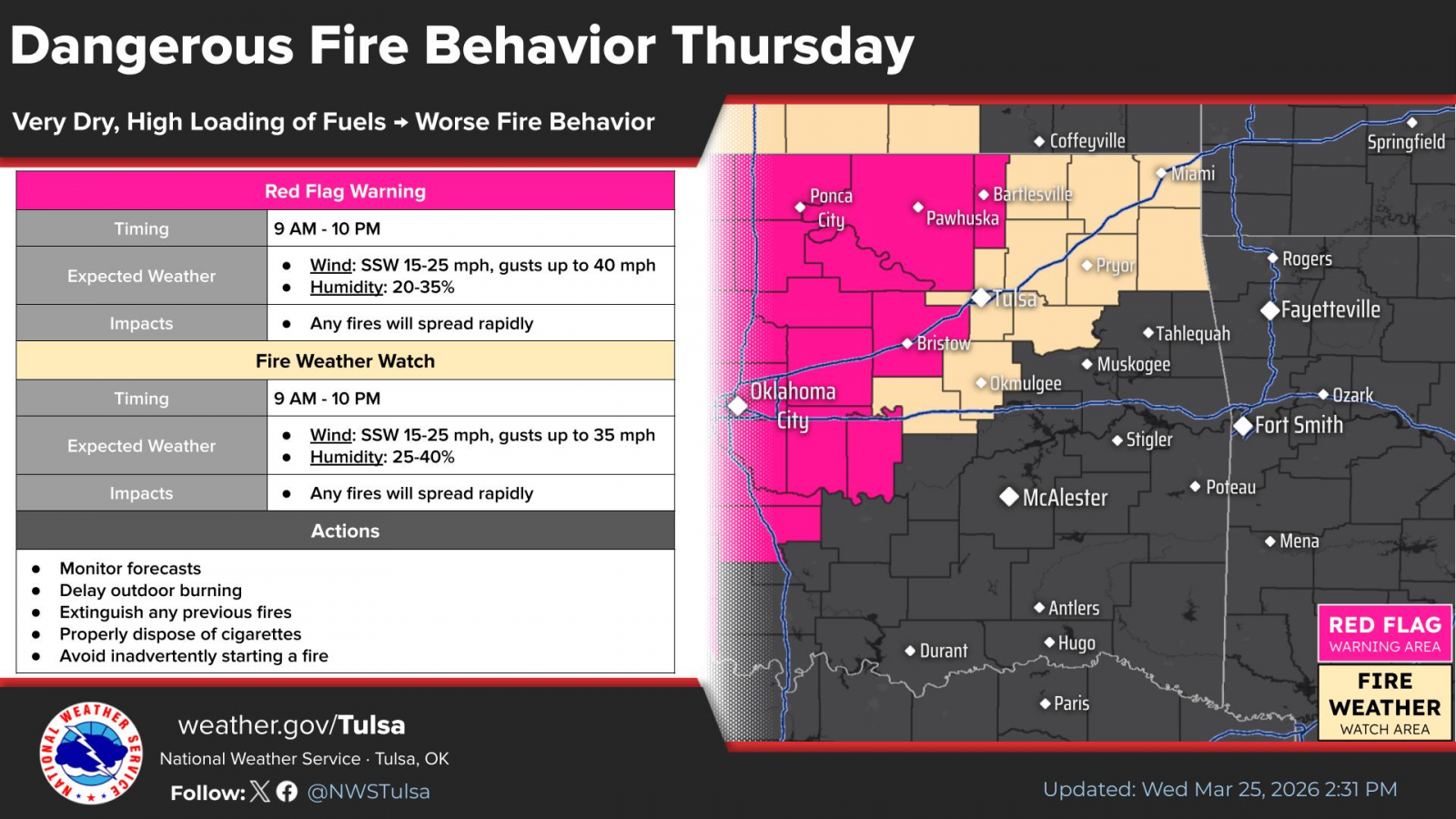 The National Weather Service issues a red flag warning for Washington and Osage counties for Thursday and a fire weather watch is in effect for Nowata County.