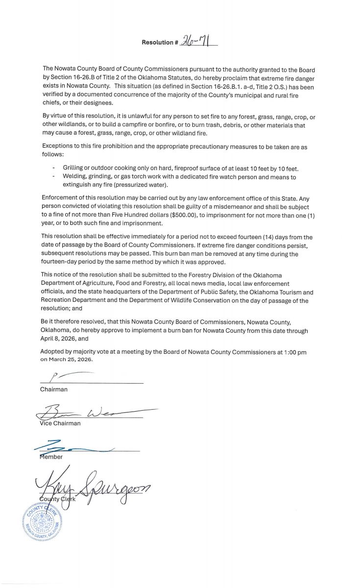The Nowata County Commissioners issued a burn ban during an emergency meeting Wednesday afternoon.