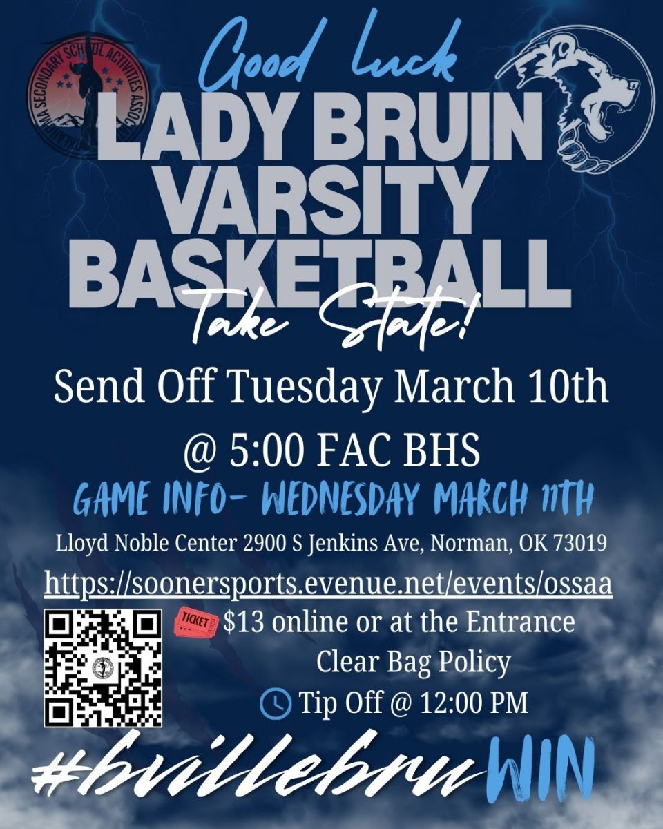 The Bartlesville High girls’ basketball team is getting set to leave for 6A State on Tuesday, as BHS will hold a sendoff for the Lady Bruins on the south side of the Fine Arts Center.